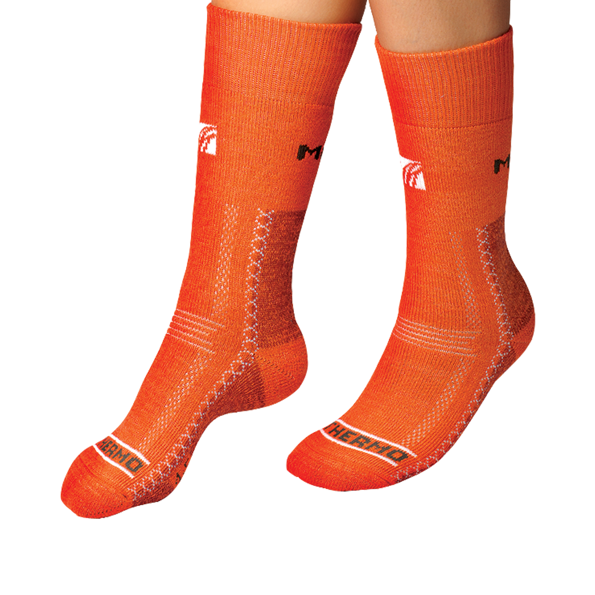 Aceste șosete foarte călduroase sunt concepute pentru condiții solicitante. Arhitectura șosetei prezintă o legătură solidă, prevăzută pe partea interioară cu o buclă densă și lungă. Buclele interioare amortizează șocurile la nivelul tălpii, fixează piciorul în încălțăminte și, datorită bunei eliminări a umidității, mențin între fibrele buclelor o cantitate mare de aer care acționează ca izolant. Vârful și călcâiul sunt întărite cu material, iar călcâiul este urmat de o zonă întărită care protejează tendonul lui Ahile. Deasupra ristului piciorului sunt aplicate benzi cu bucle elastice, care permit îndoirea confortabilă a piciorului. Cele două benzi elastice, peste ristul piciorului și sub gleznei, fixează bine șoseta pe picior. Șosetele sunt finisate cu un tiv de înălțime medie, din țesătură cu nervuri fine, dotat cu o cusătură uniformă. Construcția șosetelor permite utilizarea tuturor posibilităților tehnice ale încălțămintei moderne. În climatul deosebit de rece, se pot utiliza și inserții pentru șosete (PO/LN), care îmbunătățesc și mai mult proprietățile excelente ale acestora. Șosetele Thermo sunt însoțite de inserții, formând un set, ceea ce oferă trei variante de purtare: doar șosete, șosete cu inserție, doar inserții.